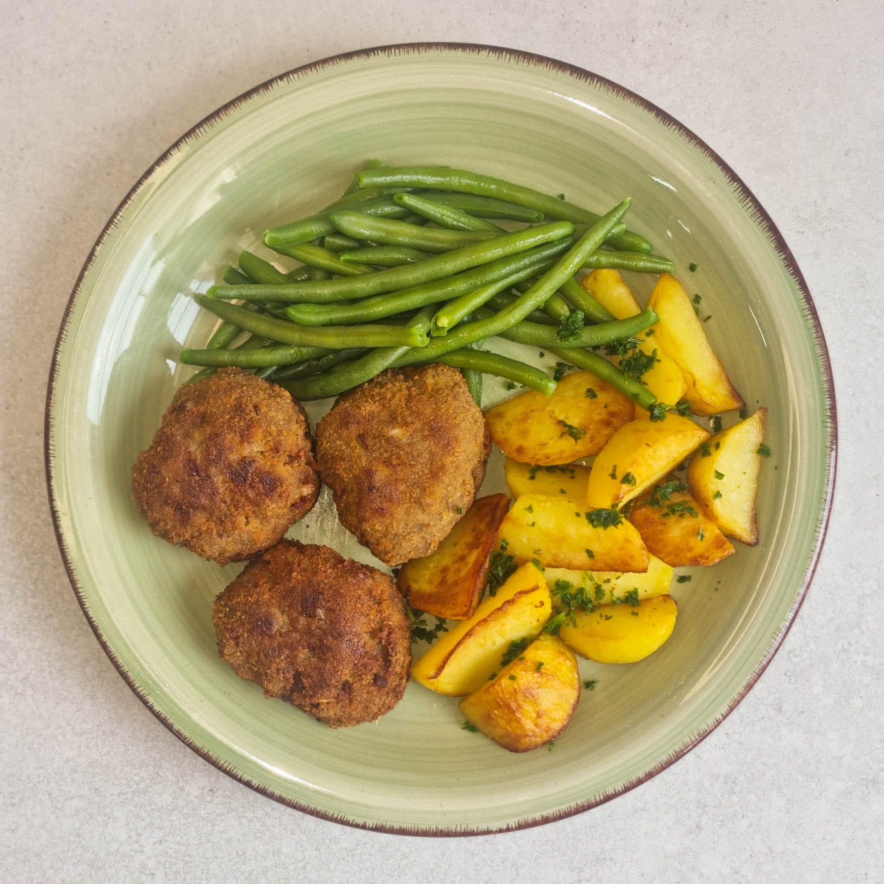 Rindfleisch (30%), Ei, Zwiebel, Knoblauch, Paniermehl, Rapsöl, Kartoffeln (35%), Bohnen (15%), Wasser, Salz, Gewürze